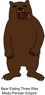 This is again the Medo-Persian empire. The bear is an appropriate symbol for the Medo-Persian empire because "This empire was much like a bear, which is feared as a beast with apparently ponderous movements but, when enraged, is capable of swift, powerful, and brutally aggressive attacks. The Medo-Persian Empire conquered Babylon and virtually every other kingdom that stood before it with its ponderous, bearlike strength."[2, p.97]. And "Daniel's vision of the three ribs in the bear's mouth prophetically represented the Persian Empire's conquest of three kingdoms (Lydia, Babylon, and Egypt). Those kingdoms had formed a defensive triple alliance to stand against the invading Persian armies"[2, p.98].