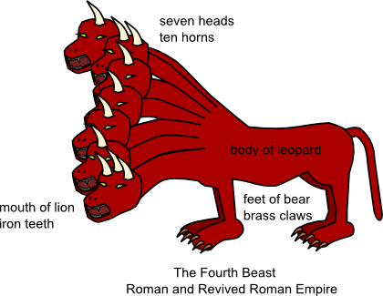 We can see the similarities between this description and the fourth empire in the vision of the statue. Here the beast has iron teeth, and the statue had iron legs. The beast also has ten horns, and the statue's feet had ten toes. So we can assume that this fourth beast also represents the Roman Empire. However, since the Roman Empire was never ruled by ten kings, and never had a king replace three other kings, clearly this prophecy is yet to be fulfilled. So again like the vision of the statue, this prophecy is speaking about the ancient Roman Empire and also about the yet-future Revived Roman Empire, which will be a union of kingdoms and have ten kings. The "little horn" that is mentioned, which comes and replaces three kings, matches well with the description of the Antichrist as found in the book of Revelation. Then finally the Antichrist's kingdom is destroyed when Jesus returns at the end of the Tribulation.