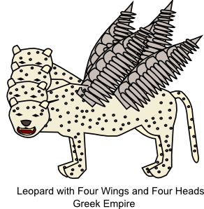 This beast represents the Greek empire, which began under Alexander the great, and then was ruled by his four top generals after Alexander's death. "Source [1 p.206] says "The use of both the four wings and the four heads may be the way the symbolism captures the two stages of this empire. The four wings are symbolic of the empire under Alexander's rule...The four heads symbolize the second stage of the empire in its stage under the four separate kingdoms. Heads are usually symbolic of kings or kingdoms, and wings are symbolic of warfare or military power."