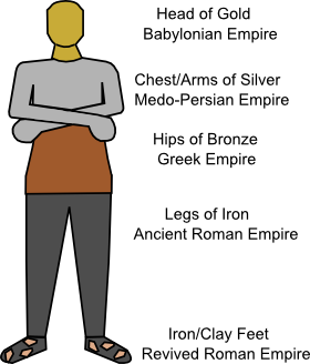 In the King's dream (Daniel 2:31-35), he sees a statue shaped like a man. The head is gold, the chest and arms are silver, the lower torso and hips are bronze, the legs are iron, and the feet/toes are iron mixed with clay. At the end of the dream a huge boulder comes and smashes the feet of the statue and destroys it, and the boulder becomes a mountain which fills the whole world.
