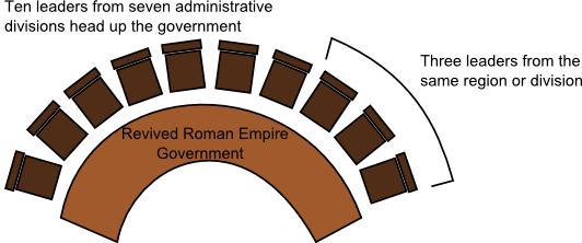 - Appear to be a form of the ancient Roman empire reborn. It will have seven major administrative or regional divisions, governed by ten leaders. This empire will be like iron mixed with clay - partly strong and partly weak, and will be a coalition or union of kingdoms. It will initially be dominated by a form of Catholicism/interfaith religion.