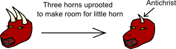 Based on the rules of interpretation from Daniel's dream, we know that the heads of the beast also represent divisions in the empires (just as the four heads on the leopard described a four-fold division in the Greek empire) and the horns on this beast represent kings. Therefore in addition to the heads representing the seven forms of ancient Roman government, they also represent seven divisions in the yet-future Revived Roman empire. So the Revived Roman empire will have seven regional or administrative divisions ruled over by ten kings. Daniel describes three horns/kings who are uprooted to make way for a smaller horn/king. I believe this probably indicates that the three kings were somehow related - perhaps from the same regional division, and they are consolidated into only one king/horn for this division. Perhaps this three-division group will be the United Kingdom, or maybe a future North American Union made of Mexico, the United States, and Canada.